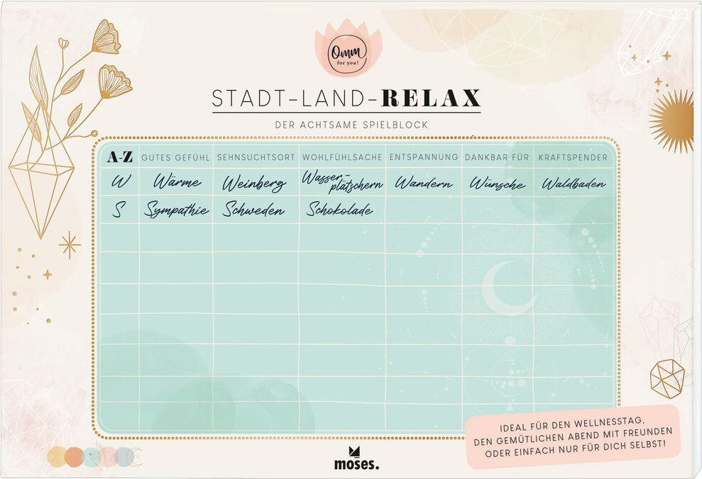 Schaffen Sie sich mehr Wohlfühl-Momente im Alltag! Der Spielblock Stadt-Land-Relax bietet Impulse für eine spielerische Einbindung von mehr Achtsamkeit und Dankbarkeit in den Alltag. Kategorien wie „Gutes Gefühl“, „Sehnsuchtsort“, „Wohlfühlsache“ oder „Dankbar für“ sollen mit passenden Begriffen mit gleichem Anfangsbuchstaben gefüllt werden und regen so zu mehr positiven Gedanken und einer Wahrnehmung der schönen Kleinigkeiten im Leben an.