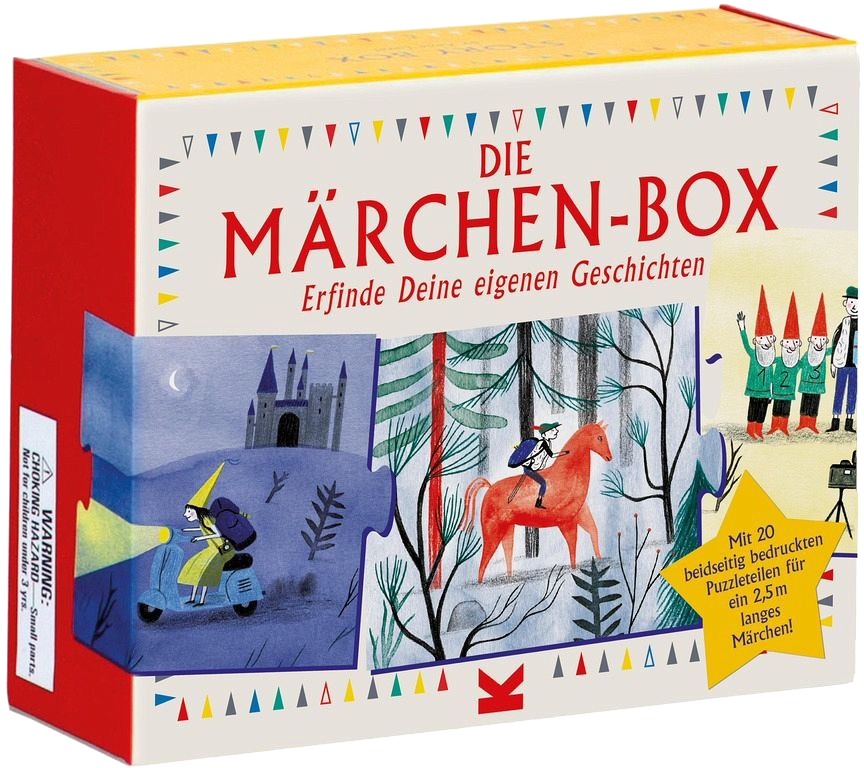 Mit dieser wunderbaren Box kannst Du eigene Märchen erfinden. Sie enthält 20 beidseitig bedruckte Puzzleteile, die untereinander ausgetauscht und verschieden kombiniert werden können. So lassen sich zahlreiche unterschiedliche Geschichten erfinden, mit drei alternativen Schlussvarianten! Kannst Du die vermisste Elfe retten, bevor sie vom großen, bösen Wolf gefressen wird? Bietet Dir die Hexe einen vergifteten Apfel an, oder wird sie Dir helfen, das riesige rosa Kaninchen, das Dein Schloss bedroht, durch Zauberei schrumpfen zu lassen?