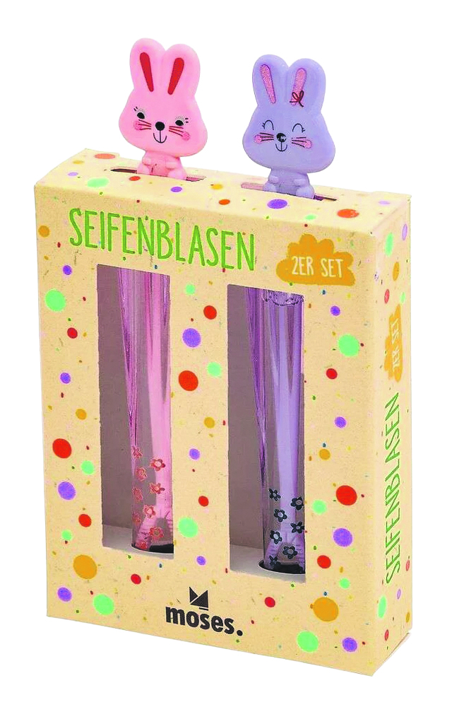 Mit diesem 2er-Set ist Seifenblasenspaß garantiert. Die Fläschchen enthalten je 5 ml Flüssigkeit und sind mit einem niedlichen Hasenkopfgesicht verschlossen. Dank der Geschenkbox ein ideales Mitbringsel oder als Präsentidee zu Ostern.