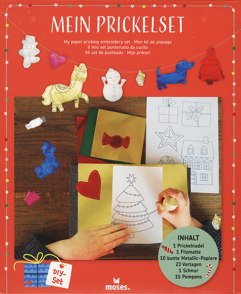Werden Sie in der besinnlichen Jahreszeit kreativ und stellen wunderschöne Prickelkunstwerke in Metalloptik oder funkelnde Wintergirlanden selber her. Mit diesem Set ist das schnell gemacht: Die Box beinhaltet neben einer Prickelmatte aus Filz (21 x 16 x 1 cm) und einer Prickelnadel mit Holzgriff 10 Metallic-Papiere, eine Schnur sowie verschiedene Pompons mit Weihnachts- und Wintermotiven.